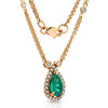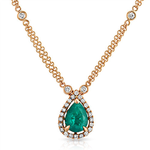 A bewitchingly charming pendant necklace set with an amazing pear-shaped emerald gem stone and round cut diamonds. It is set on a 18k rose gold rolo chain necklace.