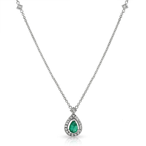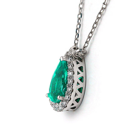 Make a grand entrance with this luxurious 18k white gold teardrop necklace. This unique 0.39 ct pear shaped Emerald pendant is surrounded by brilliant 0.23 ct diamonds in a halo floating pendant .