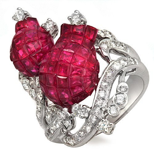Exquisite French-cut Invisible Setting Ruby and Round-cut Pave Diamond Heart-Love Ring, 18K White Gold.