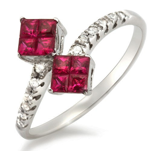 Gorgeous 2-square French-cut Invisible Setting Ruby and Round-cut Pave Diamond Ring, 18K White Gold.