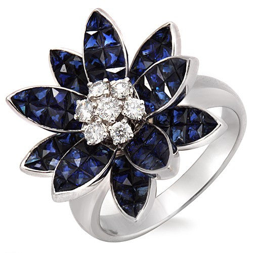 Exquisite French-cut Invisible Setting Sapphire and Round-cut Diamond Center Flower Ring, 18K White Gold.