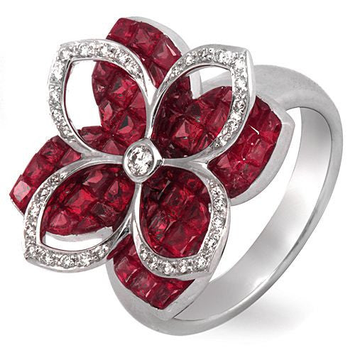 Ruby & Diamond accented in Flower Design Ring, 18k White Gold