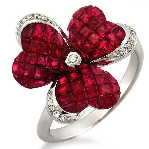 Exquisite French-cut Invisible Setting Burma Ruby and Round-cut Pave Diamond Tulip Flower Ring,18K White Gold.