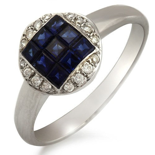 Amazing French-cut Invisible Setting Sapphire and Round-cut Diamond Elegant Square-shaped Diamond Ring, 18K White Gold.