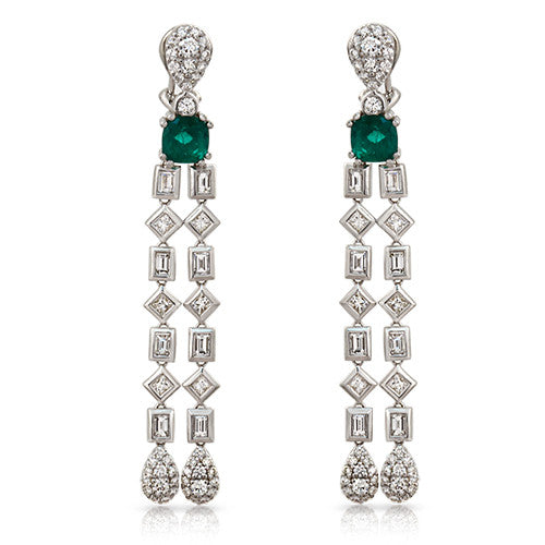 Emerald Dangling Earrings with 3.95 carat Diamonds in 14k White Gold Latch Backing